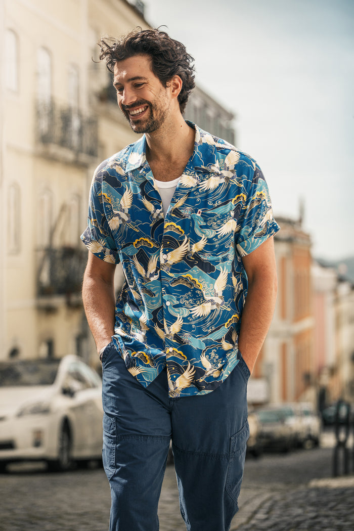 Embrace the summer with our Aloha Crane Club Shirt, designed for all your adventures. Made in Portugal, this shirt features a bespoke print and a loose fit that’s perfect for warmer weather. The turn-back cuff and Cuban collar add a relaxed vibe, while the patch pocket provides a practical touch. Crafted from 100% Viscose and finished with Corozo buttons, this shirt blends style and comfort effortlessly.