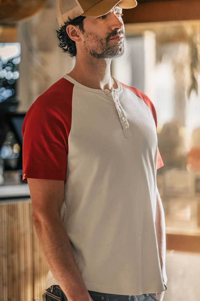 The Chariot Henley in a vibrant red hue, captures the essence of both American baseball and British heritage. This striking piece features contrasting red raglan sleeves against a raw cotton body, offering ease of movement and a nod to baseball’s rich history. Made from lightweight cotton, it’s perfect for sun-soaked days. Keep it simple and relaxed by pairing it with our Virgil Chinos, classic Baseline high-tops, and a trucker cap for a classic, masculine look that’s perfect for any season.