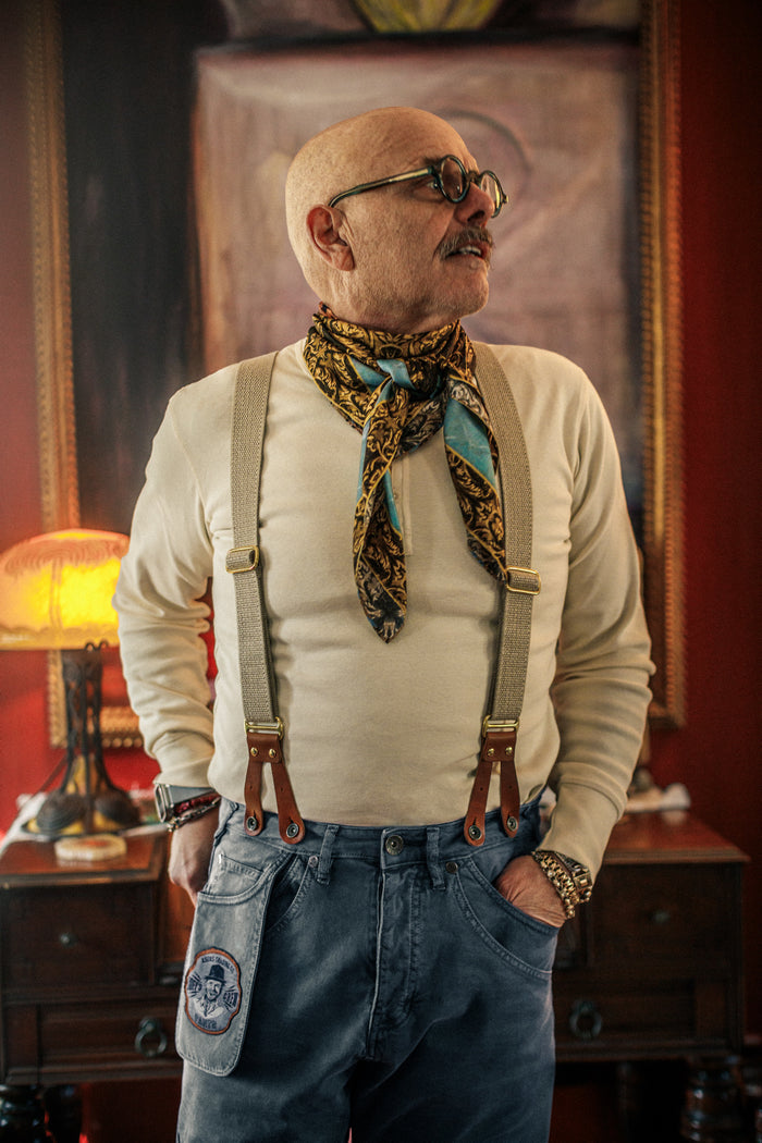 Growing up, my father was a very stylish dresser, and I wanted to emulate him. When I was around 12 years old, my family took me to the old Madison Square Garden on 50th and 8th Avenue to see the Ringling Brothers Circus. I was fascinated by the cowboy shirts, belts, hats, and boots that seemed emblematic of the circus, the Buffalo Bill Wild West Show and the rodeos that would come into New York City. I was drawn to this style and the practicality of Western wear, such as scarves that served a purpose, like protecting against dust or hiding one’s face during a robbery.