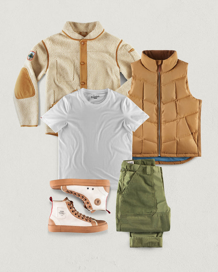 Offering a versatile balance of warmth and style, ideal for errands around town or meeting friends at a casual spot. Begin with the Essentials Tee as a lightweight base layer, adding the Takin Fleece on top for its warmth and comfortable feel. This fleece is inspired by classic mountaineering gear, adding a rugged edge. Layer the Forrest Gilet over the fleece for extra insulation and a pop of outdoorsy style. The gilet’s puffer design not only keeps your core warm but also allows for breathability. Pair with Fatigue Army Pants for a military-inspired touch that complements the rugged aesthetic. Finish with High Tops to keep things grounded yet comfortable. This look is built for chilly days, offering an all-day layered look that’s practical and stylish.