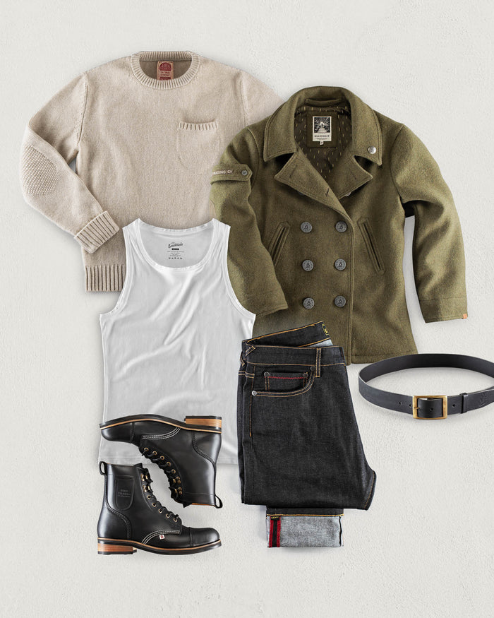 This style is both refined and winter-ready, making it perfect for dinners, casual evening events, or even a night out. Start with the Essentials Vest for a comfortable, fitted base layer that can add warmth without bulk. The Stanley Crew Neck comes next, adding texture and contrast to the outfit with its casual elegance. Over it, throw on the iconic Army Green Peacoat—a classic winter outer layer with military roots, delivering warmth and sophistication in equal measure. For pants, go with the Charcoal Brandons for a sleek, tailored look that balances the rugged coat. Finish off with Black Boots for an edgy, polished look. This outfit captures smart winter layering with comfort and style, perfect for when you want to look pulled together without sacrificing warmth.