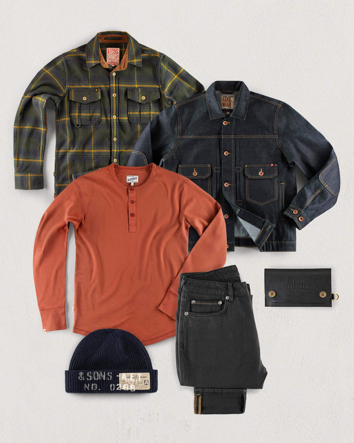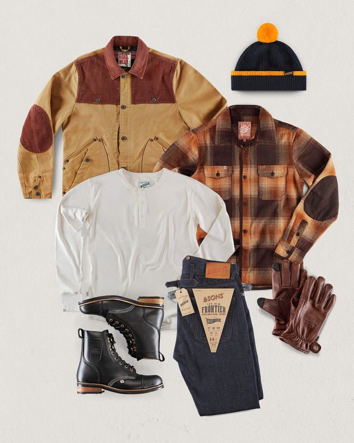 This look is ideal for relaxed weekends with a rugged touch, perfect for brunches, winter markets, or a chilly walk in the countryside. Start with the Henley Raw as your base layer. Its soft, breathable fabric offers warmth without bulk, making it a great foundation for layering. Next, add the Emberton Shirt to boost insulation and add a touch of rustic charm. This piece's texture and classic design bring character to your outfit. Top it off with the Dust Jacket for wind resistance and style—a sturdy, Western-inspired layer that’s as functional as it is stylish. Complete the look with Frontier Denims for their timeless appeal and durability, and throw on a Watch Cap to keep your head warm in style. With this outfit, you'll feel comfortably layered for any winter weekend adventure.