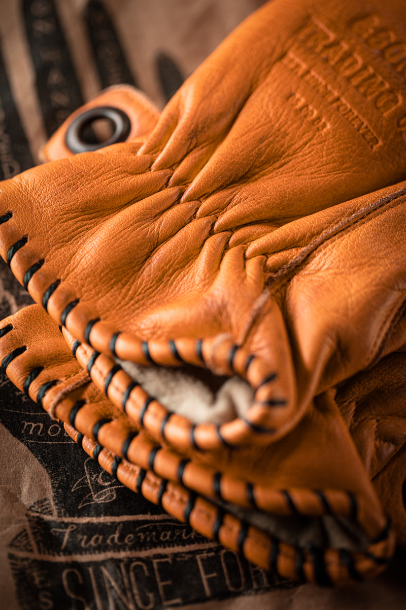 Our gloves are constructed from a supple calf leather which has been worn in with a slight patina straight from the maker. Over time, the leather will slowly age producing a unique fade and finish that mould to your hands. We have added a fleece lining to keep your hands warm in the winter or when out on the bike and finished with a de-bossed branding stamp on the upper side.
